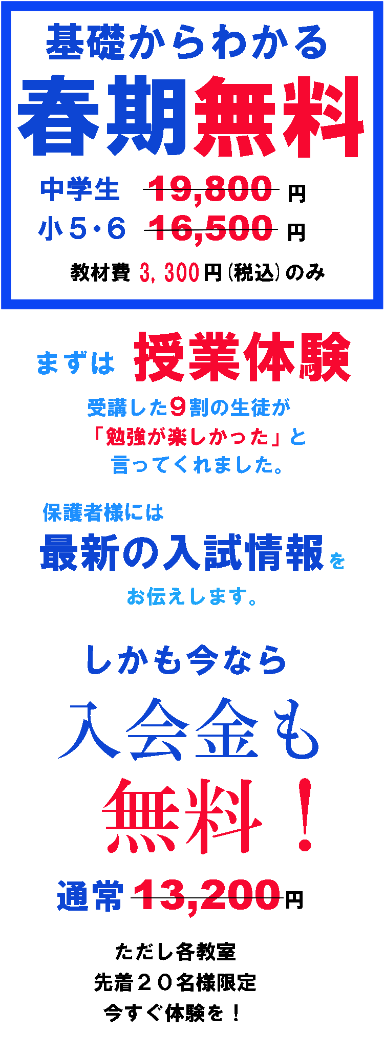 なお、今なら、各教室とも先着20名様に限り、入会金と春期講習費の総額3.3万円が無料となるキャンペーンを実施しています。